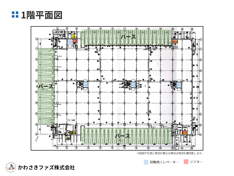 トラックバース 1階3面 計60ドッグ(高床式) 有効天井高 各階5.5m 床荷重 1,2階 1.7t/㎡、3,4階 1.2t/㎡ 昇降設備 エレベーター:3.0t ×4基、リフター:1.5t ×3基 |